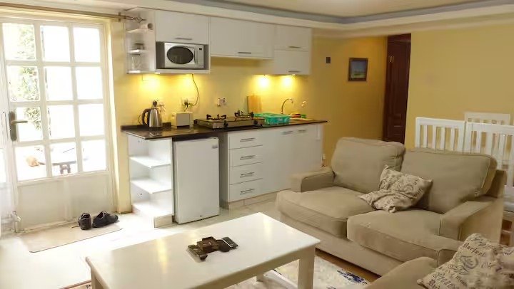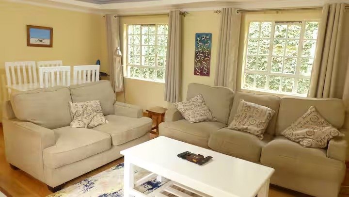 We welcome you to our newly renovated guesthouse, in the gardens of our home off Kiambu Rd, the green suburbs of Nairobi. Enjoy a comfortable living room and well equipped kitchen, with wifi and 24 h security. Relax in the front yard or take a stroll in the large garden to enjoy the flowers and the birds. We are at 8 km (20 minutes) from UNEP’s headquarters in Gigiri, with shopping malls Village Market and Two Rivers, and 2 km (5 minutes) from Thindigua with Quickmart and Naivas supermarkets.