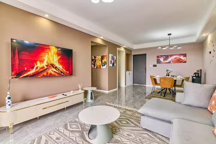 Stylish Living Space:-Step into a beautifully designed living area featuring modern furnishings, chic décor, and floor-to-ceiling windows that flood the space with natural light. Relax on the plush sofa or catch up on your favorite shows on the smart TV with streaming services.