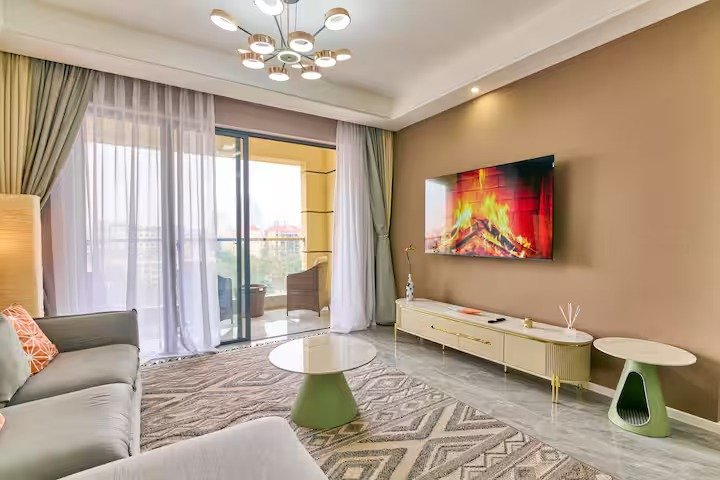 Stylish Living Space:-Step into a beautifully designed living area featuring modern furnishings, chic décor, and floor-to-ceiling windows that flood the space with natural light. Relax on the plush sofa or catch up on your favorite shows on the smart TV with streaming services.