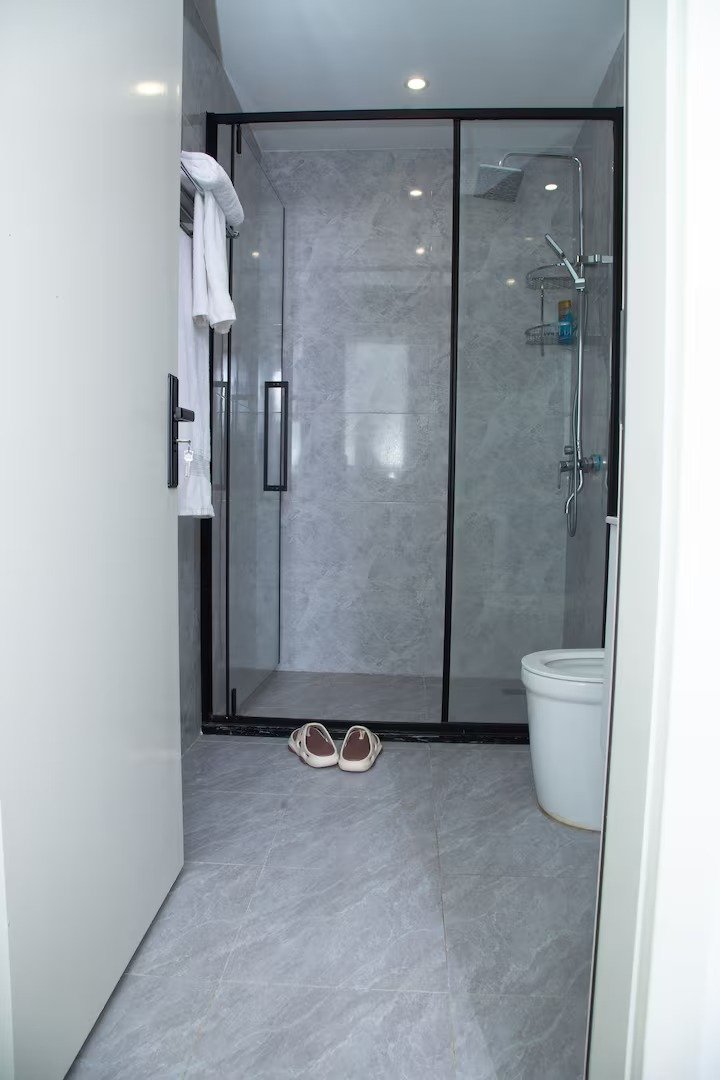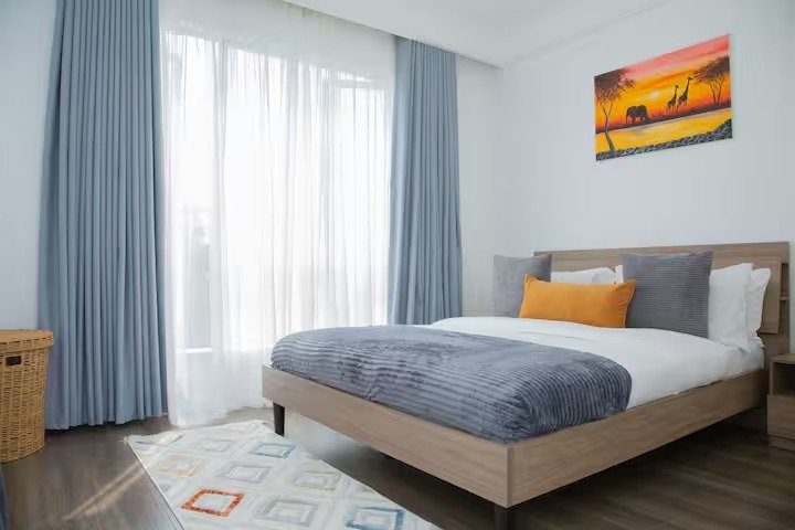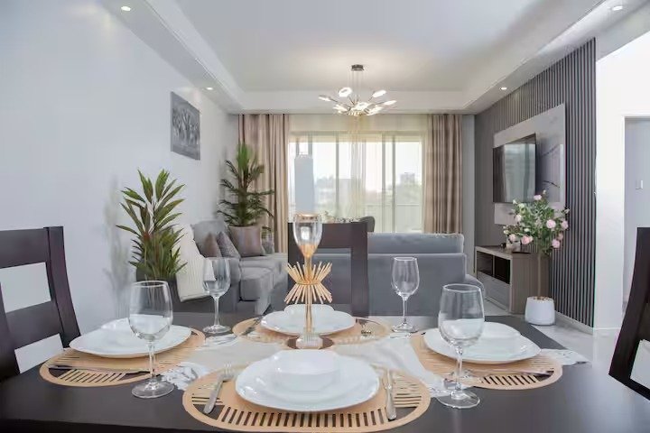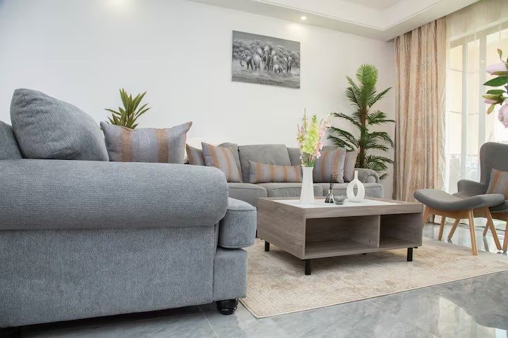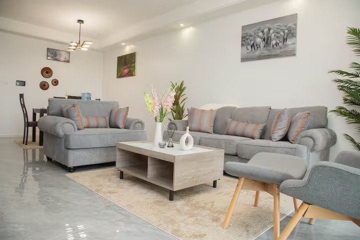 Teg’s place is tucked in Kilimani, Nairobi’s vibrant, leafy neighborhood minutes from the CBD perfectly balancing city buzz with tranquil charm. This one-bedroom en-suite features a cozy queen-size bed. The spacious living room includes comfortable sofas. The dining area seats four and easily doubles as a work-from-home space. An additional guest toilet adds extra convenience.