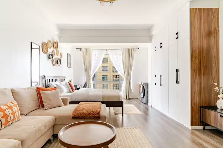 Living Room: The living room is bright and airy, featuring a comfortable sofa, a flat-screen TV, and a stylish coffee table. Large windows allow plenty of natural light to fill the space, making it a perfect spot to relax or catch up on work.