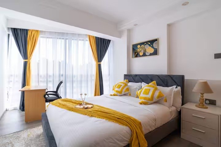 Indulge in luxury at our 1-bedroom apartment in the heart of Kileleshwa, kilimani and westlands. Has an opulent living space with high-end furnishings, a fully-equipped gourmet kitchen, and modern electronics e.g. a 55′ TV. After exploring the city, retreat to your tranquil bedroom with a queen-sized bed, ensuring a peaceful night’s sleep. The private balcony has stunning city views, ideal for a peaceful romantic evening and Perfect for a refined business trip