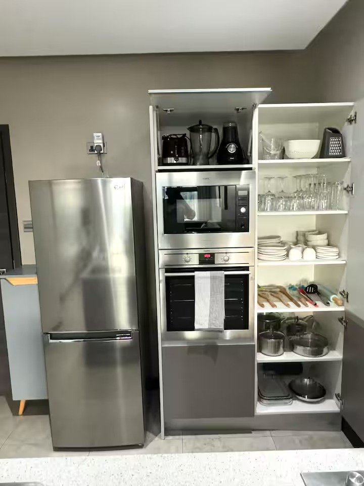 The listing has amazing natural light with views of the surrounding trees in the neighborhood and you can spot the super highway & Ngong hills from a distance. The natural light beams directly into the space creating great effects on the light grey and chrome hints on the furniture as well as the fine wall art.