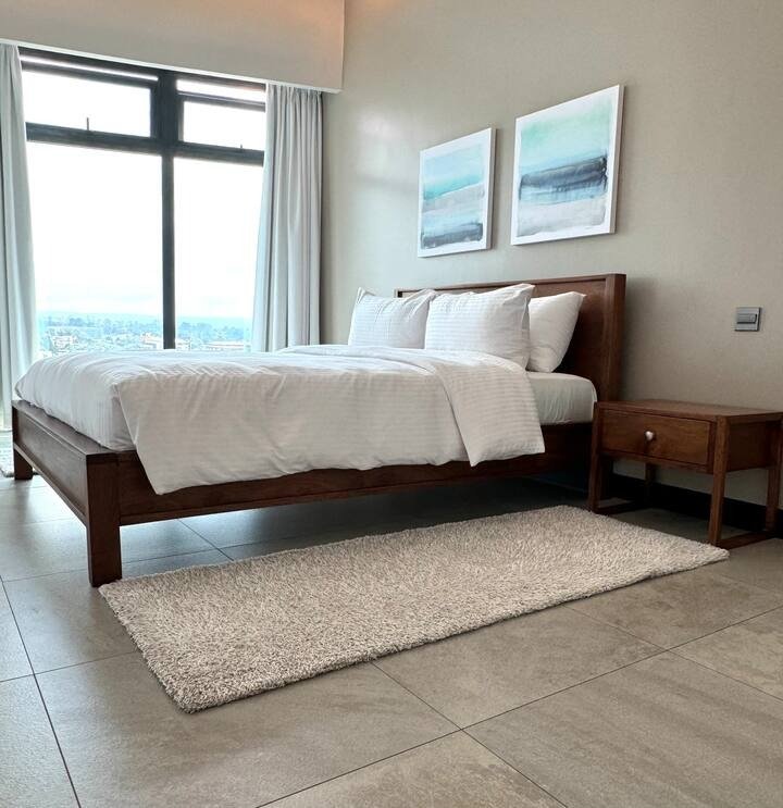 The listing is situated on the 13th floor of a futuristic design complex boasting of Nairobi skyline views from the ceiling to floor windows in all spaces of the home.