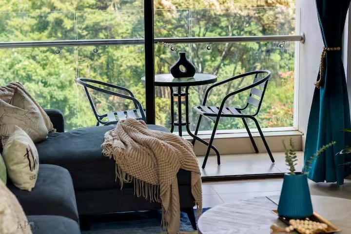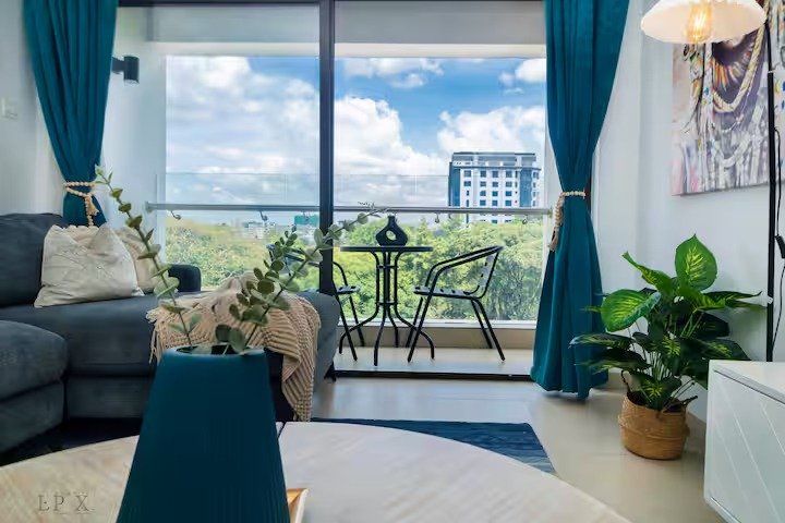 The living room is spacious with large living room window that lets in maximum light and has an open kitchen plan. There is a large balcony with a lovely view from 4th floor and it’s quiet and serene. The sofa can be converted to a bed by joining with ottoman and is indeed comfy. There is 1 large king bed and 1 bath and toilet.