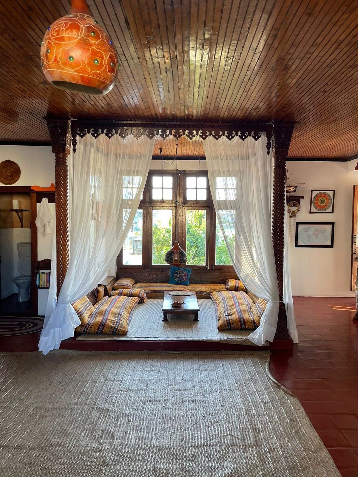 Shared bathroom and a traditional majlis seating area for relaxation and socializing.