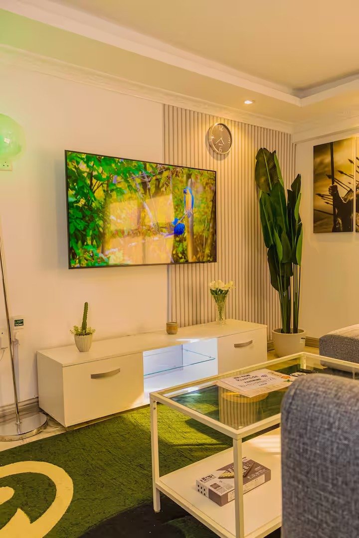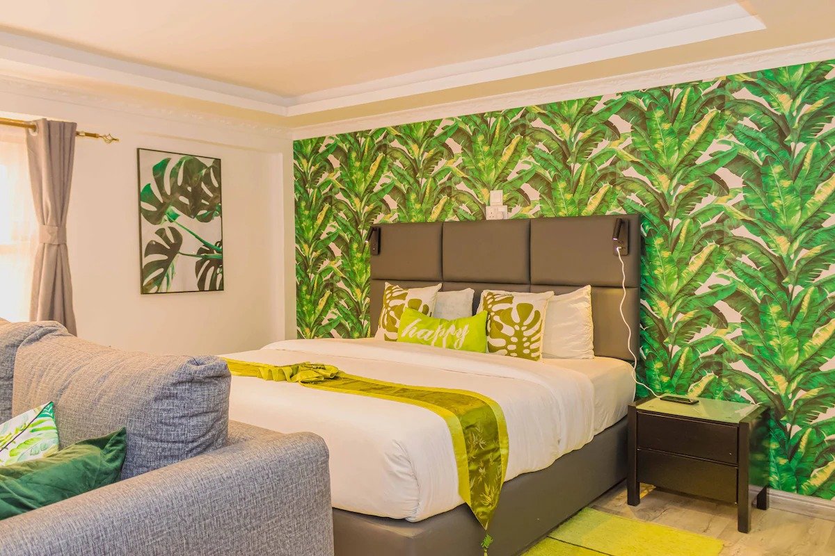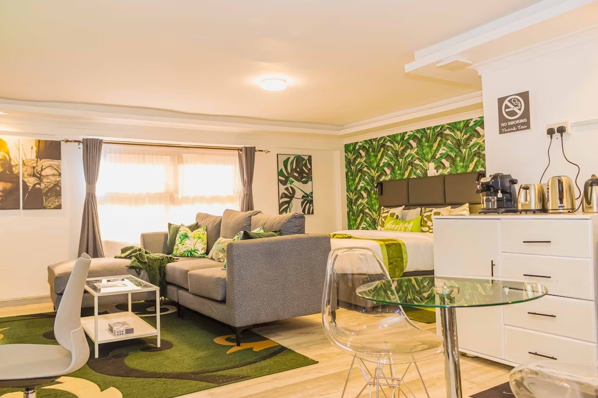 Indulge in urban luxury at our centrally located studio, featuring a lavish king-size bed. Situated in the quiet and safe Nanyuki town, few minutes walk from the vibrant Cedar Mall, our premise offers a range of amenities, including a refreshing pool, a river bank, camping, picnic site with lots of mature trees and greenery , – all within a beautifully landscaped garden. Plus, enjoy entertainment on our impressive 55″ TV with a complimentary Netflix subscription.