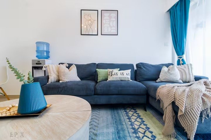The living room is spacious with large living room window that lets in maximum light and has an open kitchen plan. There is a large balcony with a lovely view from 4th floor and it’s quiet and serene. The sofa can be converted to a bed by joining with ottoman and is indeed comfy. There is 1 large king bed and 1 bath and toilet.