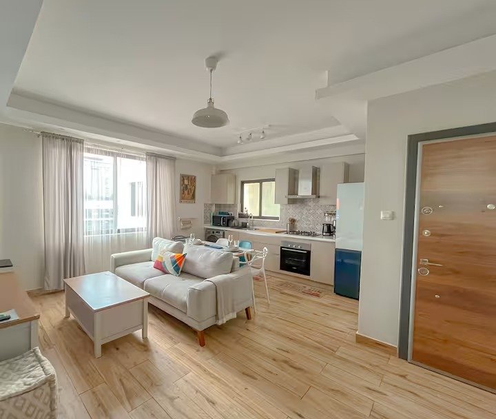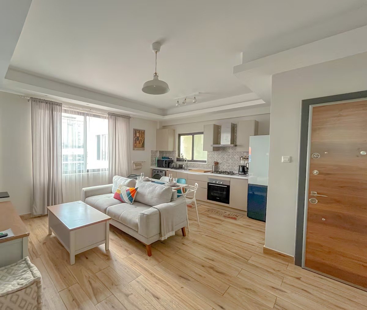 The apartment is elegantly designed with a fully equipped kitchen and washing machine.