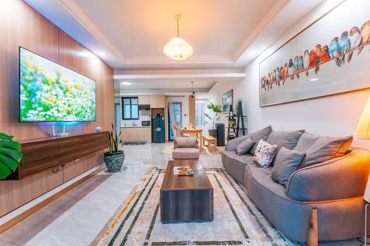 This Cozy home away from home is Located in Kileleshwa, the 7th floor of Leswha Apartment, just a few kilometres off JOMO KENYATTA AIRPORT. This space offers a stunning view of the city center from your private balcony. The apartment is thoughtfully designed with a well-furnished luxury living room featuring a 65-inch Smart TV, beautiful artworks, stylish lighting, and a cozy bookshelf. For added convenience, Alexa is connected to all electronics, allowing you to control your space effortlessly. The standard rooms and bathrooms are designed for comfort, making this apartment a true home away from home.