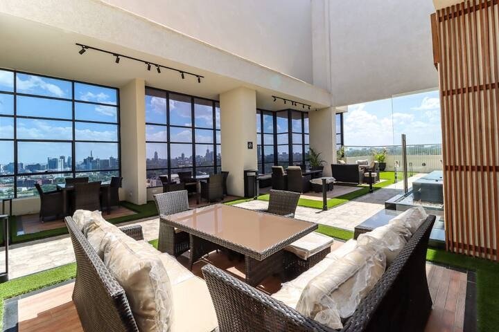 Enjoy rooftop views, a swimming pool, a gym, and a lounge area.