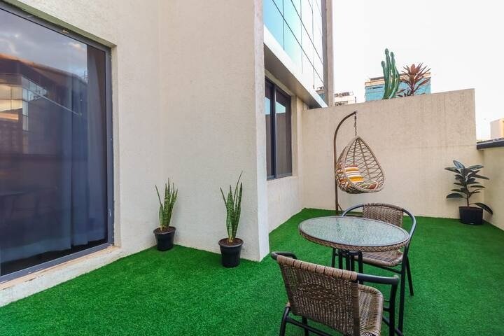 The apartment has a smart TV, high-speed Wi-Fi, a washing machine, a study area, a dining area, and a fully equipped kitchenette. Step onto the large private balcony, complete with a cozy swing and outdoor seating for two—perfect for unwinding with a book or enjoying a relaxed evening with a friend.