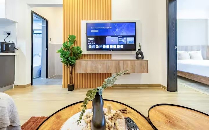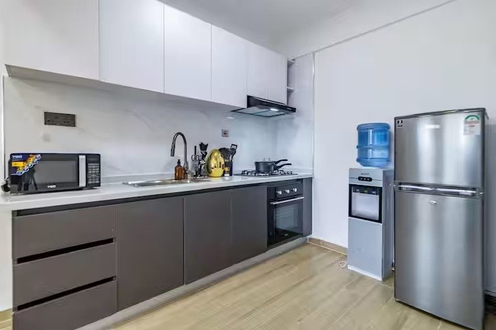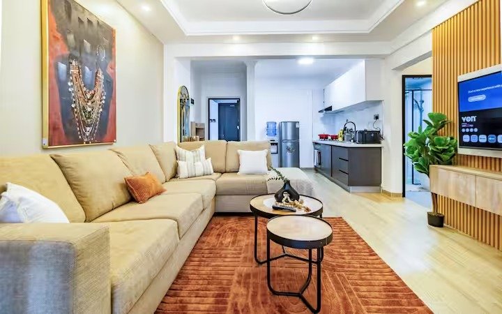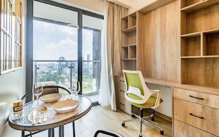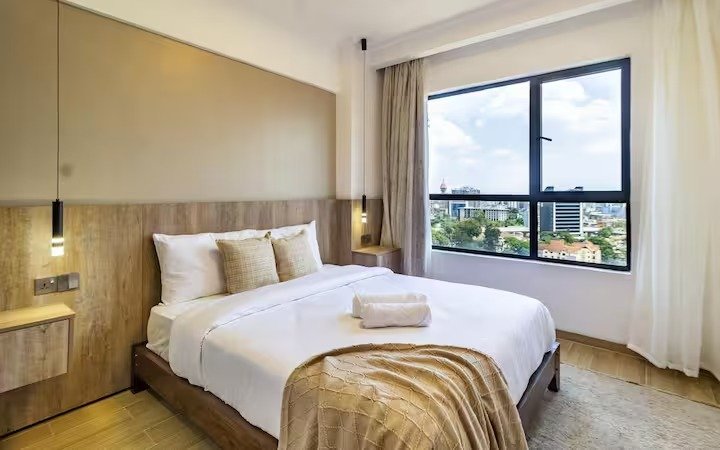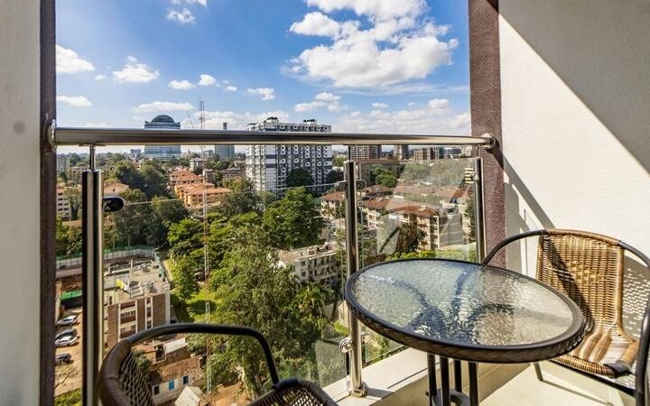 This is a spacious 1 bedroom with full functional open plan kitchen . There is a desk for home office.., and a nice balcony with a view to watch the city by day and the well lit Nairobi skyline by night