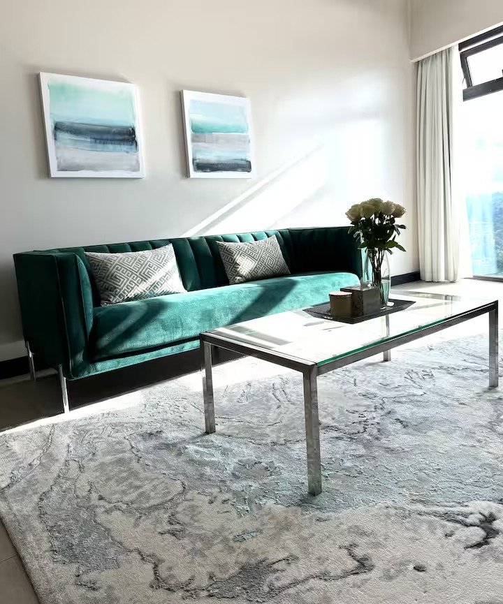 The listing has amazing natural light with views of the surrounding trees in the neighborhood and you can spot the super highway & Ngong hills from a distance. The natural light beams directly into the space creating great effects on the light grey and chrome hints on the furniture as well as the fine wall art.