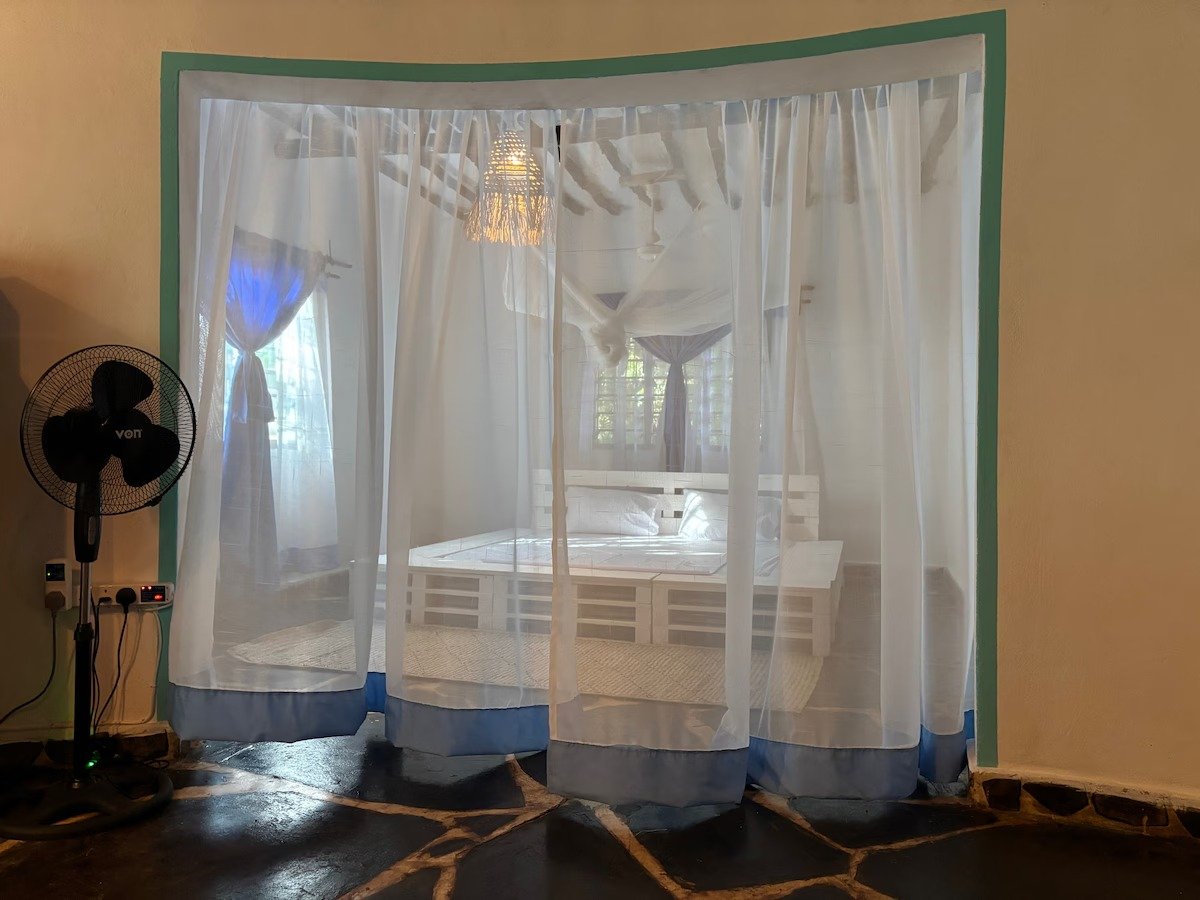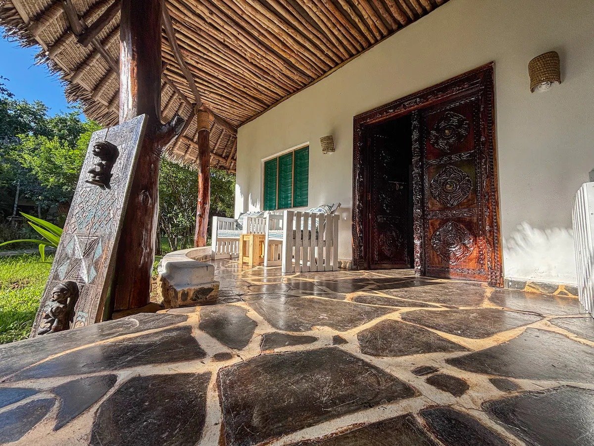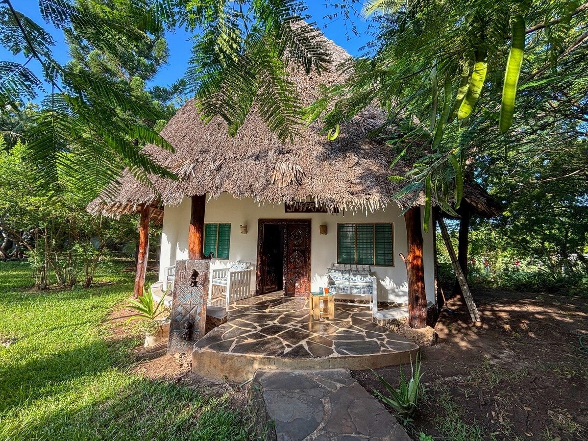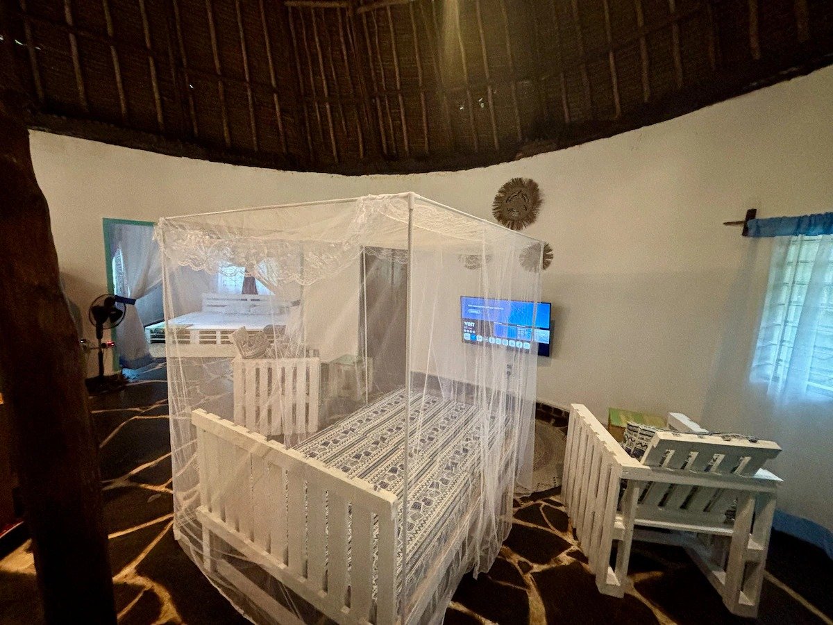 Unique 1BR cottage in a serene, lush compound—just 15 mins to Diani Beach. Designed with a high makuti roof for natural cooling, it features a spacious 6×6 bed, full kitchen, smart TV, quiet fans, and a hot waterfall shower.