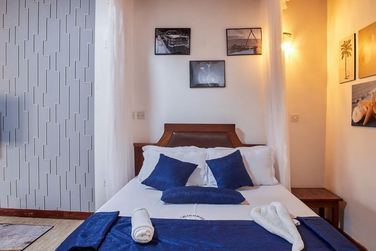 The apartment includes a full bathroom and a well-equipped kitchen stocked with essential tools for convenient meal preparation and cooking.