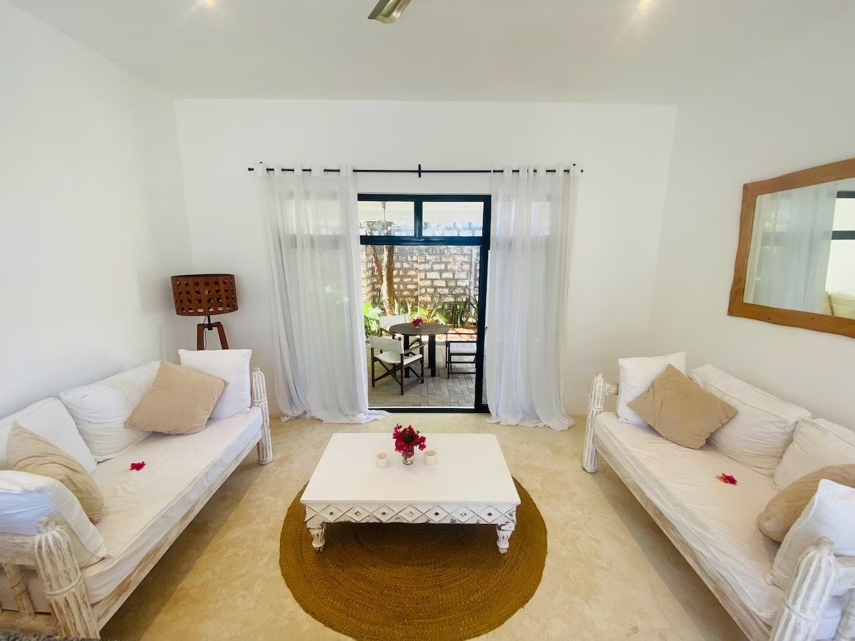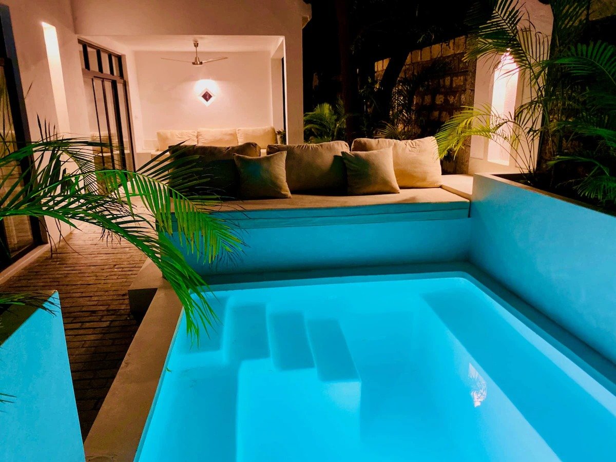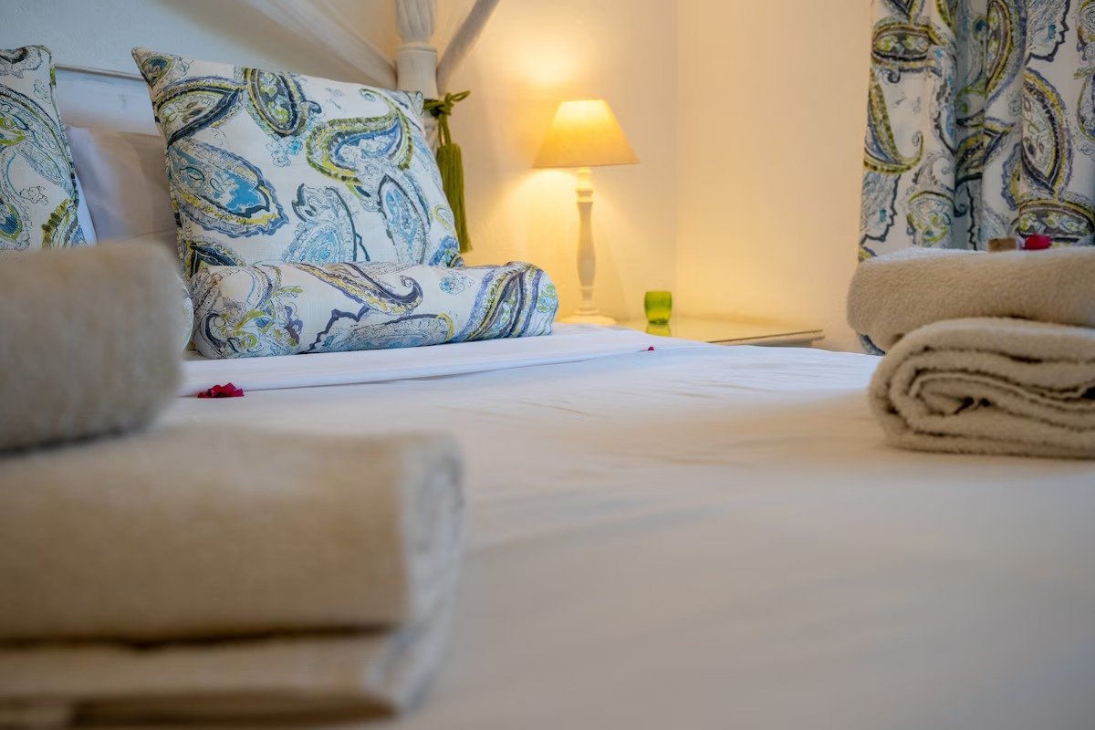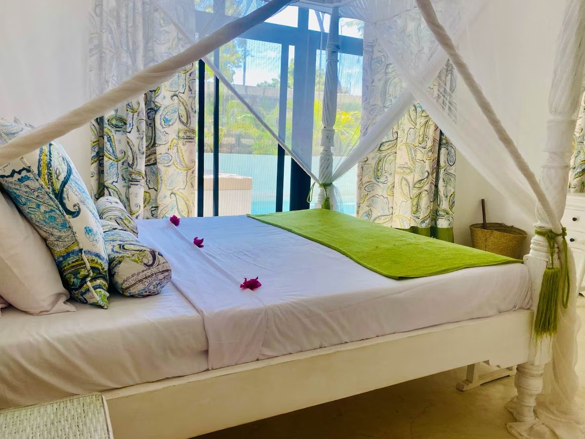 Large shower room and double bedroom with four poster bed with mosquito netting .