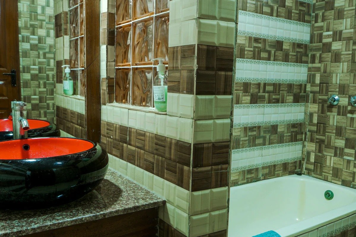 The apartment has two full bathrooms, each equipped with a shower, toilet, and sink. Fresh towels and basic toiletries are provided for your convenience.