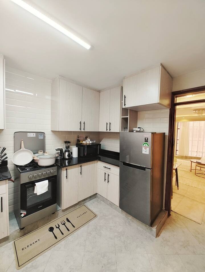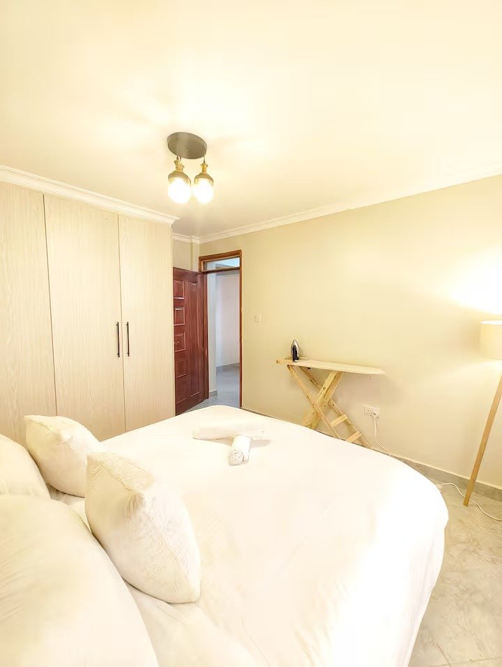 Serenity Suite, is a cozy modern 2-bedroom apartment with a warm minimalist design. The living area features an open-plan layout with comfortable seating and abundant natural light. Tasteful décor and a relaxed ambiance make this space perfect for unwinding after a day of exploring Nairobi. In addition to enjoying high speed internet and a smart TV, you’ll find that every area is designed with comfort and style in mind.