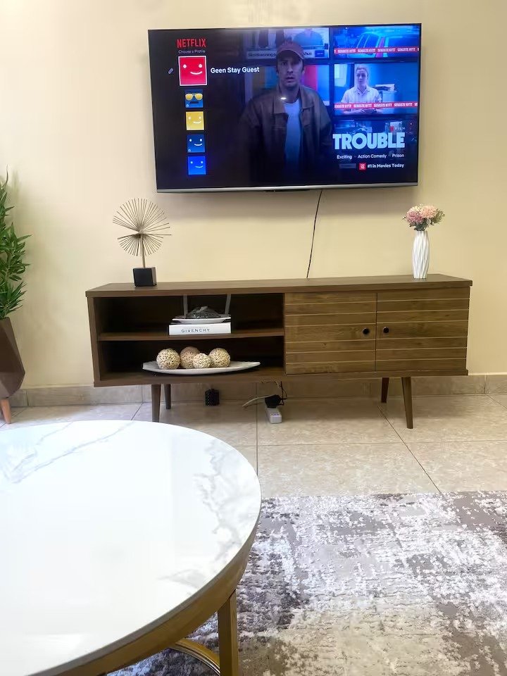 The apartment features a dual washing/dryer machine, high-speed reliable WiFi, a 55-inch smart TV with a Netflix subscription, and a fully equipped and stocked kitchen with modern utensils and a fridge, coffee maker, toaster, and kettle