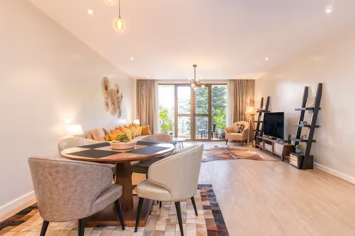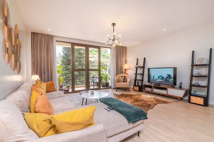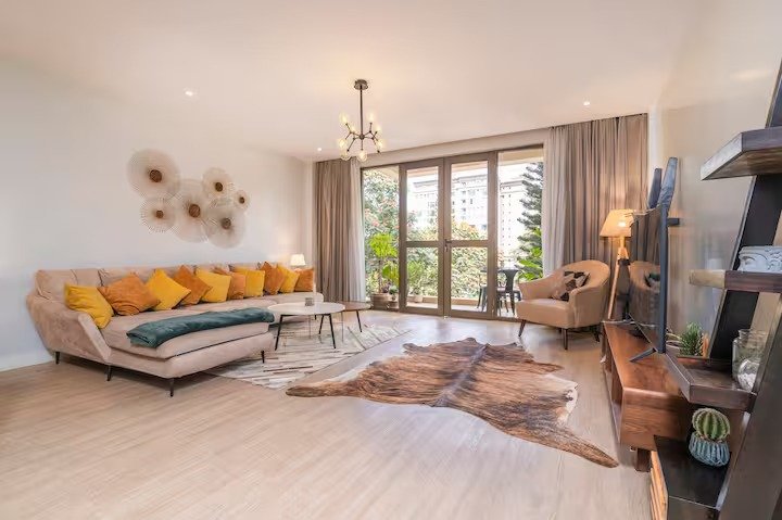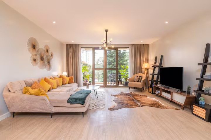 This two-bedroom apartment tucked away in the heart of Westlands is bordered by nature and an urban area filled with plenty of stores and restaurants, giving you the best of both worlds. The space’s bohemian and natural design provides a warm and relaxing living environment. It offers a contemporary kitchen with plenty of counter space as well as an open-concept living area with polished wooden floors and wide couch sets.