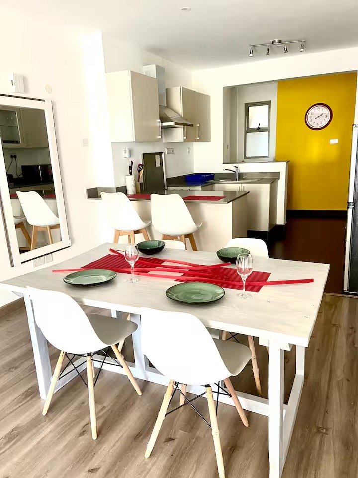 The apartment is situated of a new and modern building, a large balcony to sip your wine. High speed 20Mbps , a 55″ smart TV with Netflix. The building has full back up generator. The dining table offers working space for the business travellers. Selected African and modern decor details make the apartment stand out.