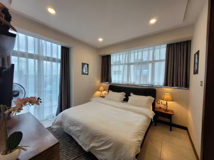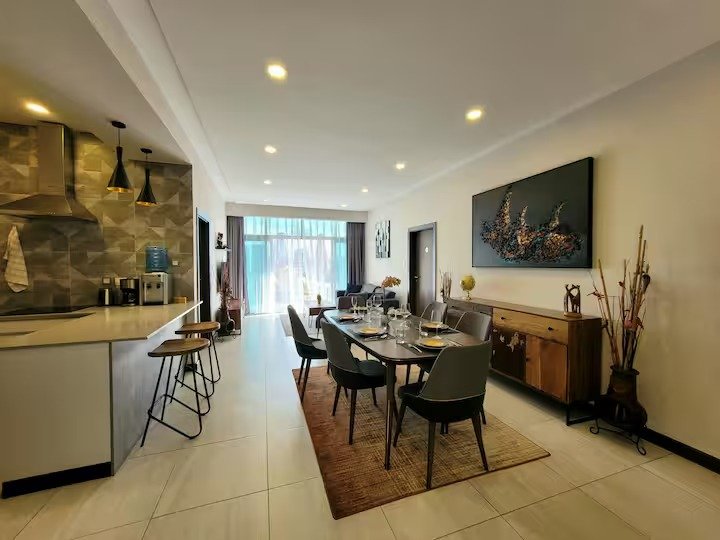 Our high-end Apartment (108m²) on the 9th floor features modern design and art with fully equipped kitchen. The balcony gives you a stunning view, outdoor furniture, and a hammock. The 2 Bedrooms comes with king size beds and private bathrooms.
