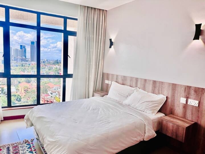 Our spacious serviced apartment comes with a master bedroom with 270 degrees stunning city view, complete with an ensuite bathroom, second bedroom, and a guest bathroom, overall perfect for a couple or group of friends. The fully fitted kitchen is equipped with everything you need to prepare meals and the dining table is perfect for enjoying them. The living area features a comfortable seating area and a 55-inch smart TV, perfect for relaxing after a long day of exploring Nairobi. The balcony provides great views of the skyline and is the perfect place to enjoy a cup of coffee or take in the sunrise. All rooms are well-lit with natural light and are designed to offer superb ventilation, ensuring you’ll be comfortable throughout your stay.