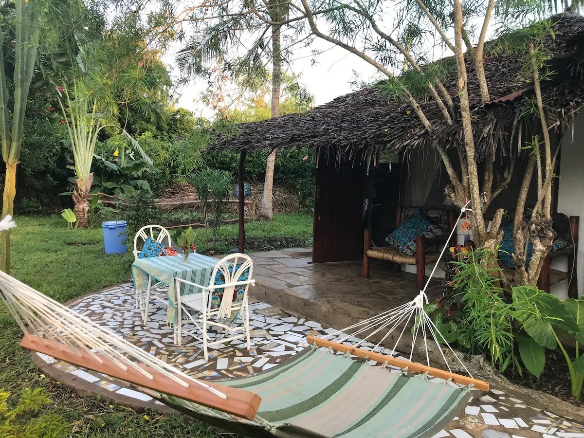This family-friendly bungalow is ideal for families of four, offering an open-plan layout with a king bed and double bed separated by natural wood partitions and curtains—providing privacy while keeping kids within sight.