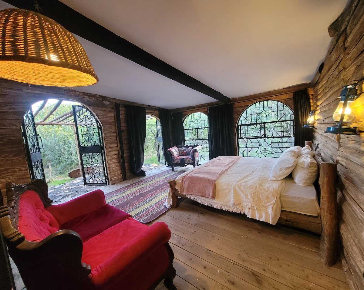 Our Aframe is tucked behind bush & golden hour sunrise & sunset bathe the cottage in glorious warm glows of natural light. This log cabin has more windows …than walls!