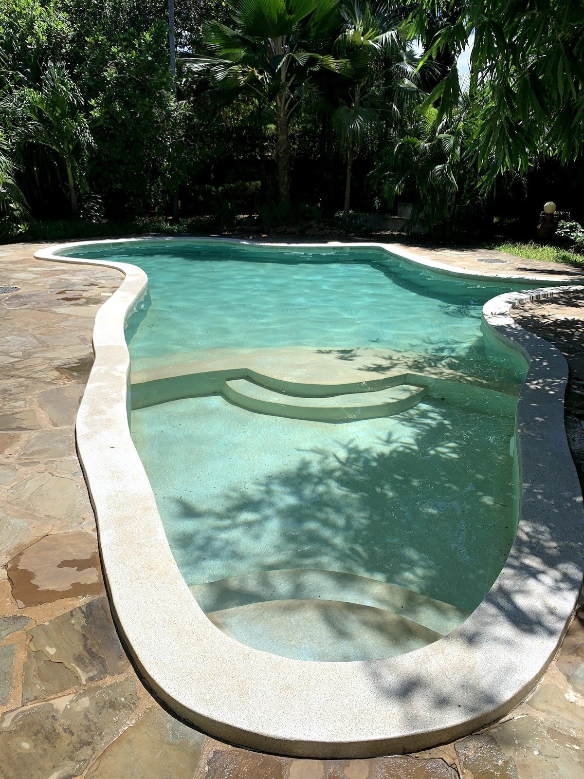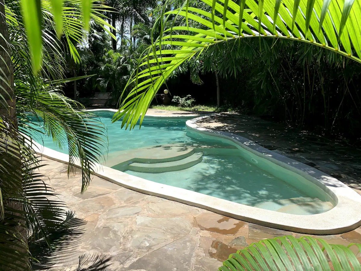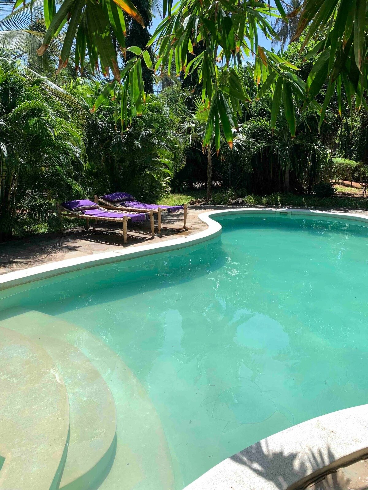 The one story house is set back away from the street in tropical gardens. As you enter the large Zanzibar-esque front door you will find an open plan area with lounge, dining area and desk for work. There is a Smart Tv you can connect to with Screen mirroring from your device. There are two large bedrooms off the living area. One has a king size bed with four poster mosquito net and ensuite shower room and the other has a king size bed and a double decker/Bunk bed. There is a well equipped kitchen with everything you could need for self-catering.