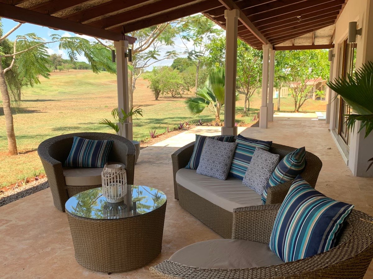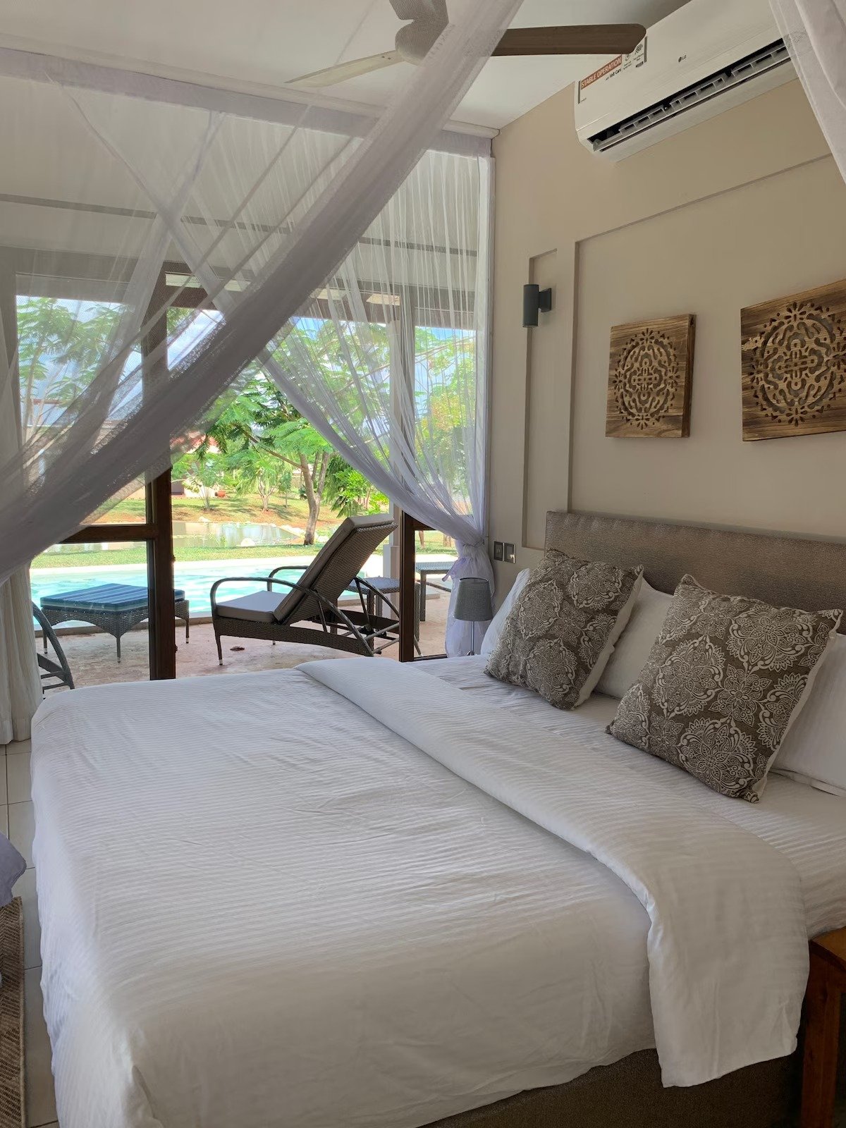 Carved Swahili doors open in to a modern, spacious living area that spills out on to a large terrace. Links 5 is within easy walking distance of the Club house which is open for all meals as well as the sundowner sports bar complete with tennis courts, pool table, lap pool & pizza oven. But if you prefer to dine in there is a an open plan kitchen with everything you will need during your stay. The bedrooms are either side of the house, with separate access on to the terrace, both with their own bathrooms, each with a walk in shower. The beds have full mosquito nets, overhead fans & air conditioning. The terrace has a 6 seater dining table for al-fresco meals. The sun loungers around the pool are a perfect place to chill in the afternoon sun, but if you prefer to do some serious swimming the communal lap pool at the sundowner bar is a short walk away! The roof top bar enjoys 360’ views and is the best spot to watch the sun set over the Chodari hills and palm fringed valleys beyond.