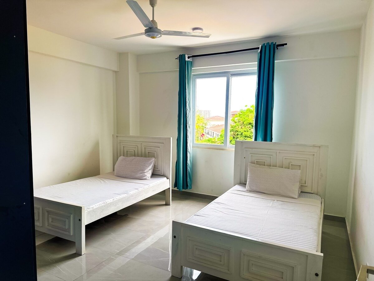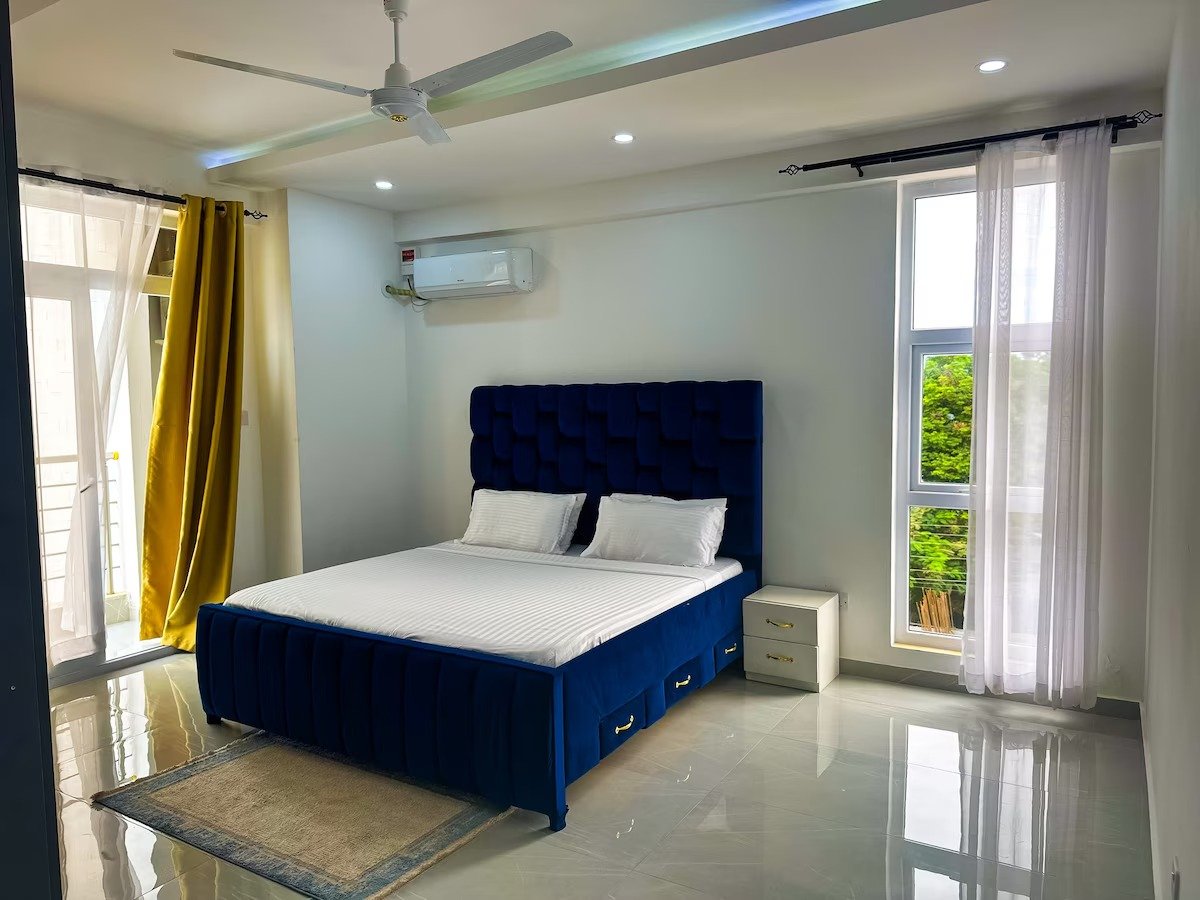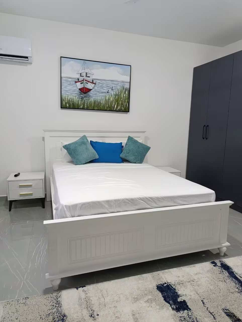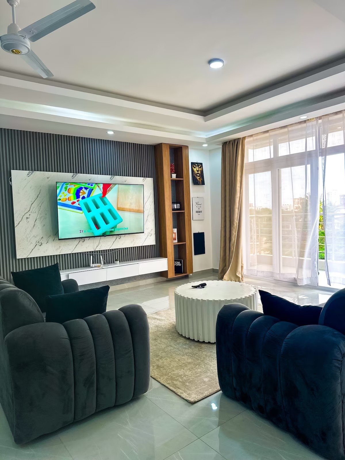 The apartment consists of a large living room with large wall to wall windows. A full equipped kitchen with the most modern equipment. There are three bedrooms, two en suite. There are three washrooms in the apartment. a large balcony with outdoor sitting area. A laundry area and a second balcony in the master bedroom. There’s a shared lift, a children’s play areas, a swimming pool and a gym. Parking is available for free.
