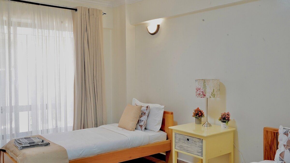 The apartment can accommodate 6 with 2 double beds 2 bedrooms and 2 single beds in another spacious bedroom. It’s perfect, centrally located in a quiet area of town. The mall and town are just a few minutes away. (3mins )