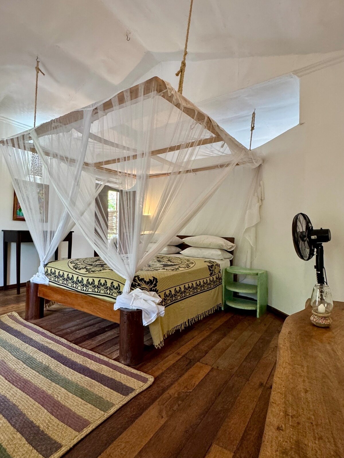 En-suite room with a double bed under a mosquito net