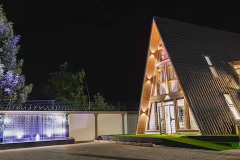 A-Frame luxury retreat in Nanyuki, Kenya. It has 3 bedrooms all en-suite, a chef’s kitchen that’s fully equipped, interior decor of rustic charm with modern comforts, featuring cozy furniture, high-speed internet, and smart TVs. An exterior dining area, gazebo equipped with a smart TV, DSTV cable, comfortable seating, and a BBQ-ready fully kitted exterior kitchen. A spacious balcony offers stunning views of Mount Kenya and Aberdares. Swimming pool, ample parking & a manicured garden.
