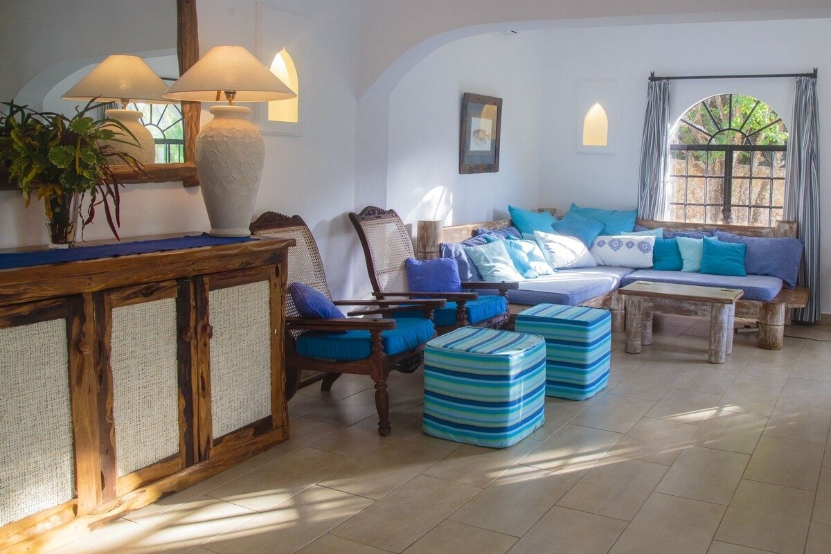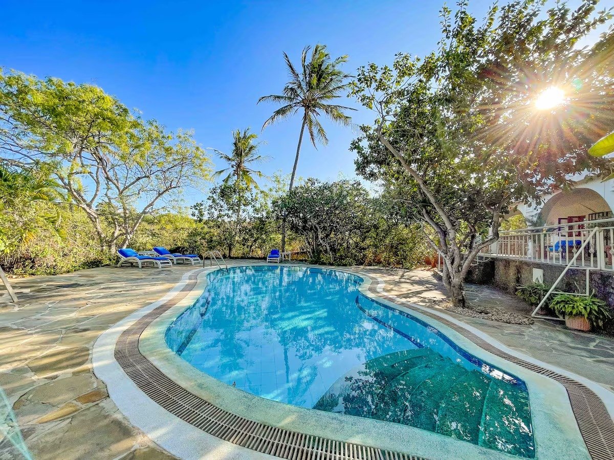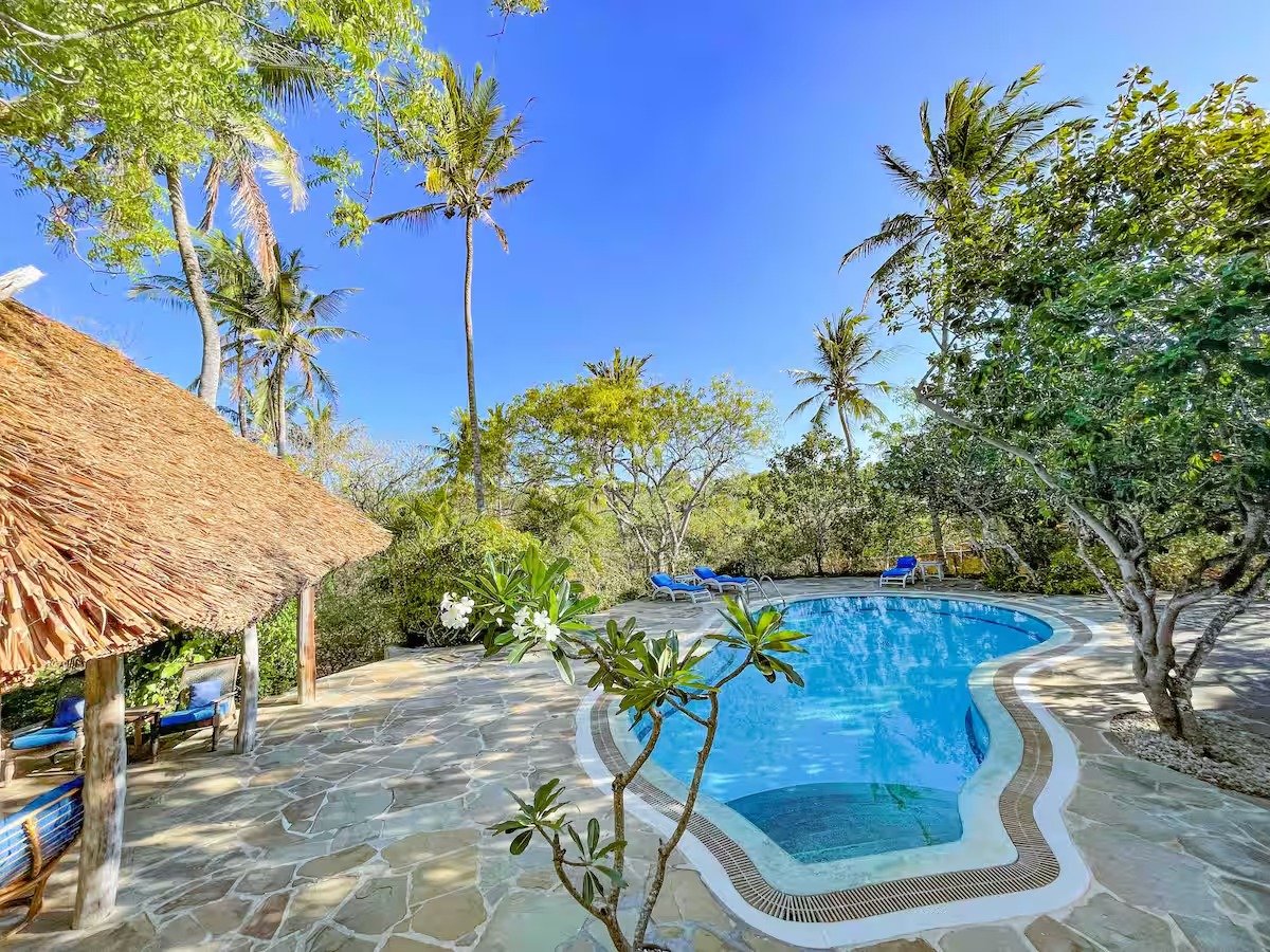A lovely second row 3 bedroom house nestled in lush gardens with its own private beach access. An open plan sitting room & dinning lead through large doors onto the veranda that overlooks the swimming pool surrounded by frangipani. Located around the swimming pool is a “chill out” pool house, with lots of comfy seating, your days will be well spent here with a good book. The tropical 1-acre garden is surrounded by coconut palms, indigenous trees & is home to many birds & wildlife.