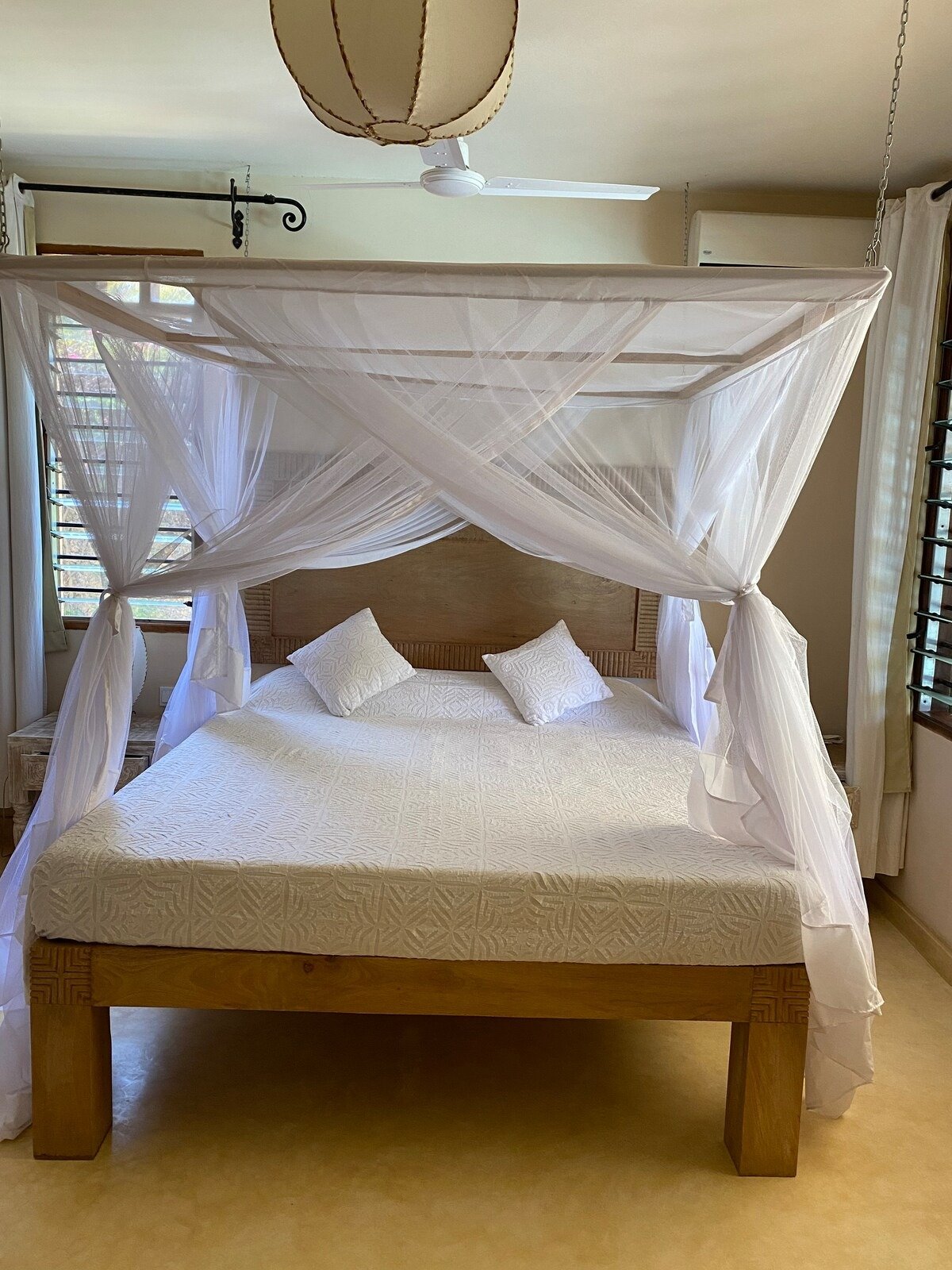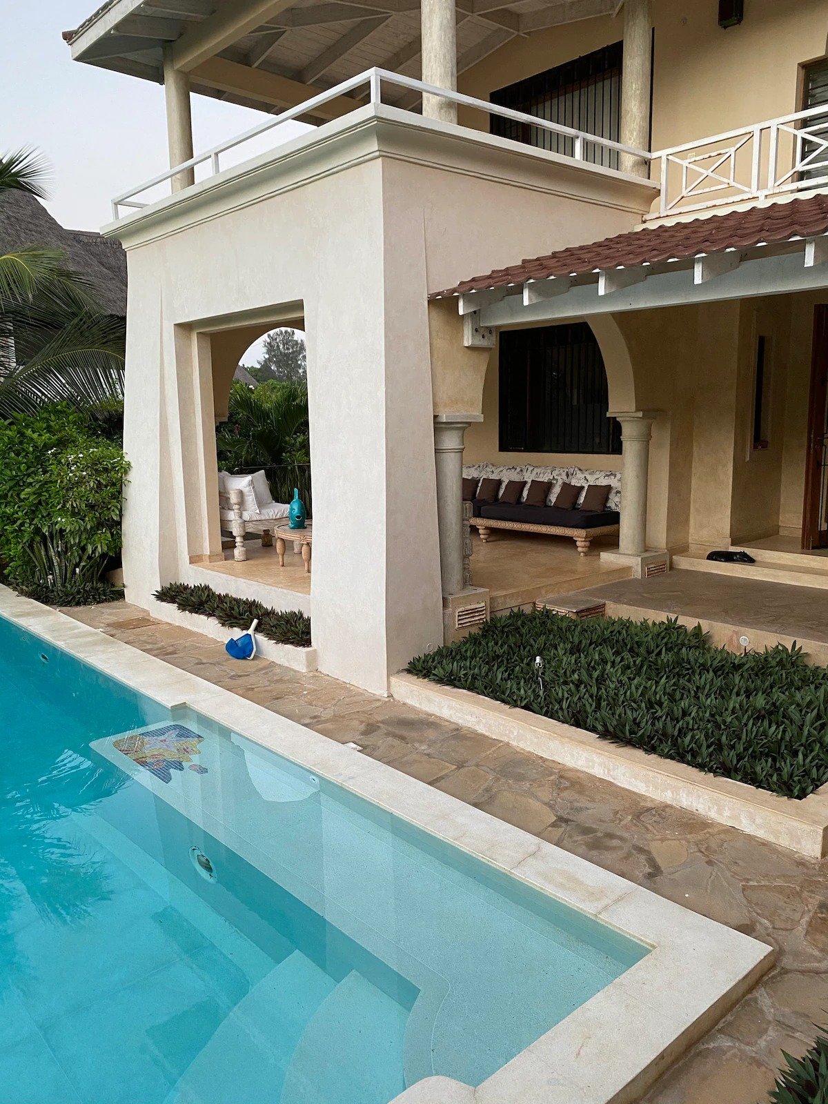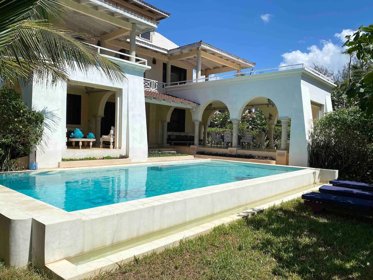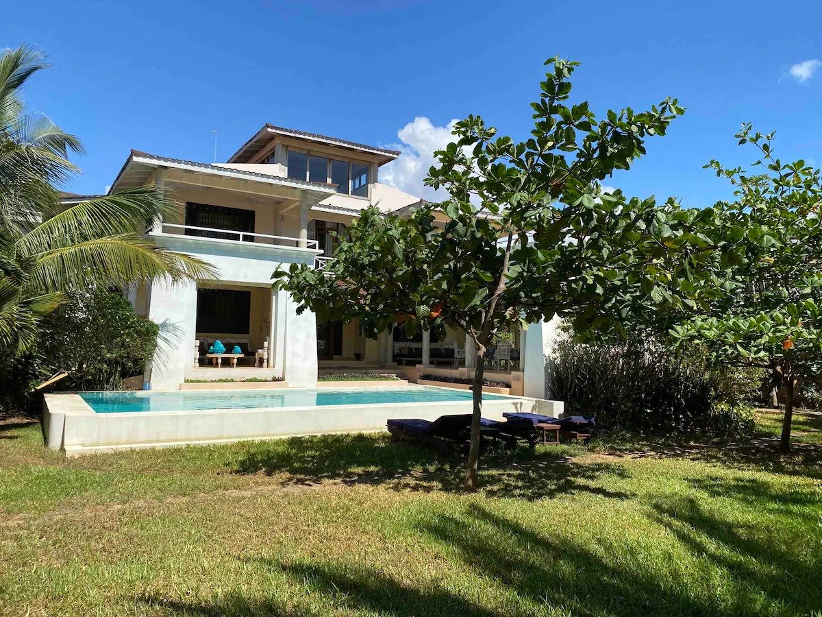 Garden level with three bedrooms, three bathrooms, living room, kitchen, swimming pool, garden, first floor balcony with ocean view, laundry area, parking space, private exit to the beach, Wi-Fi