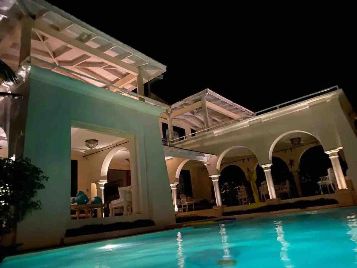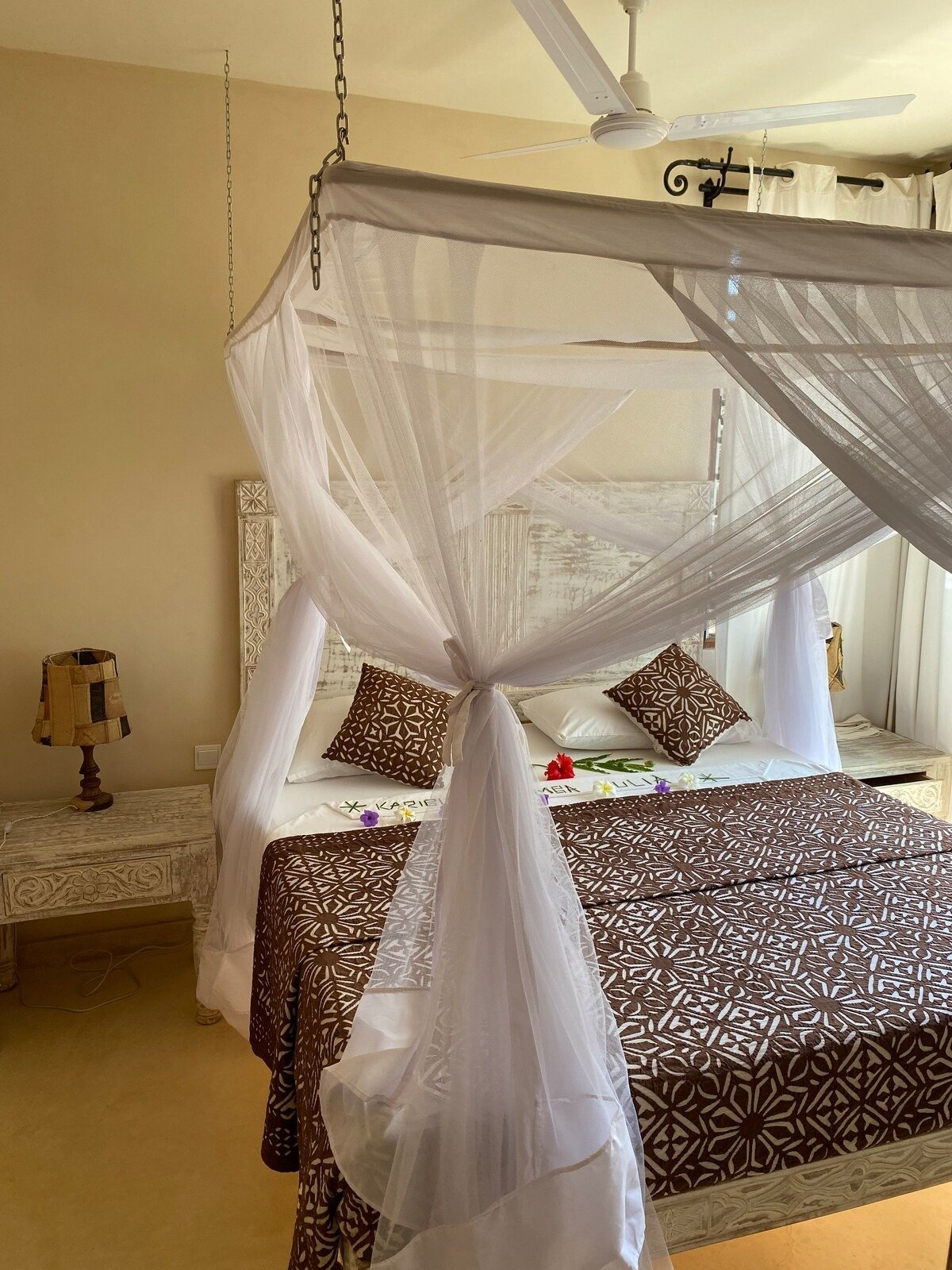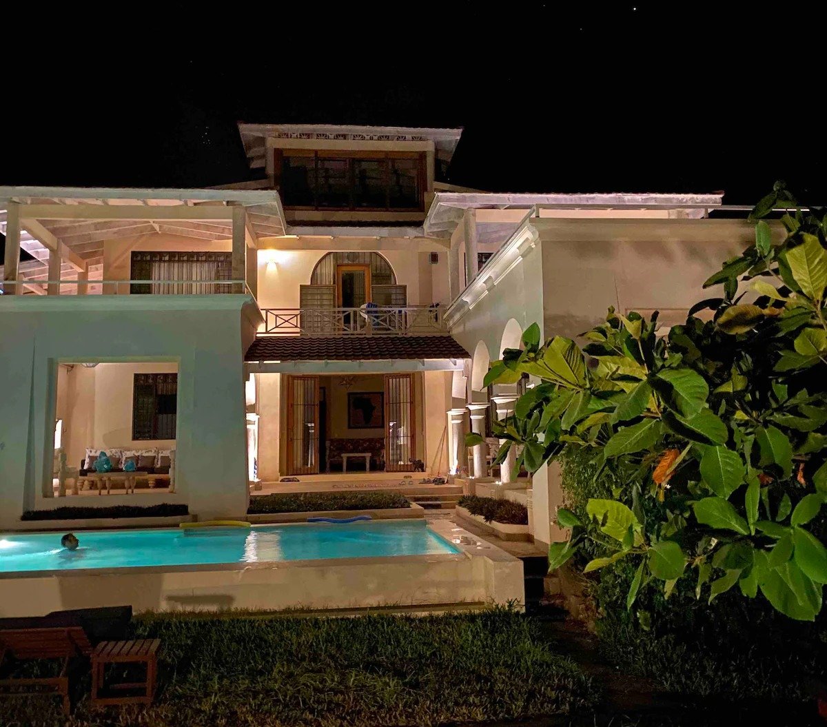 Garden level with three bedrooms, three bathrooms, living room, kitchen, swimming pool, garden, first floor balcony with ocean view, laundry area, parking space, private exit to the beach, Wi-Fi
