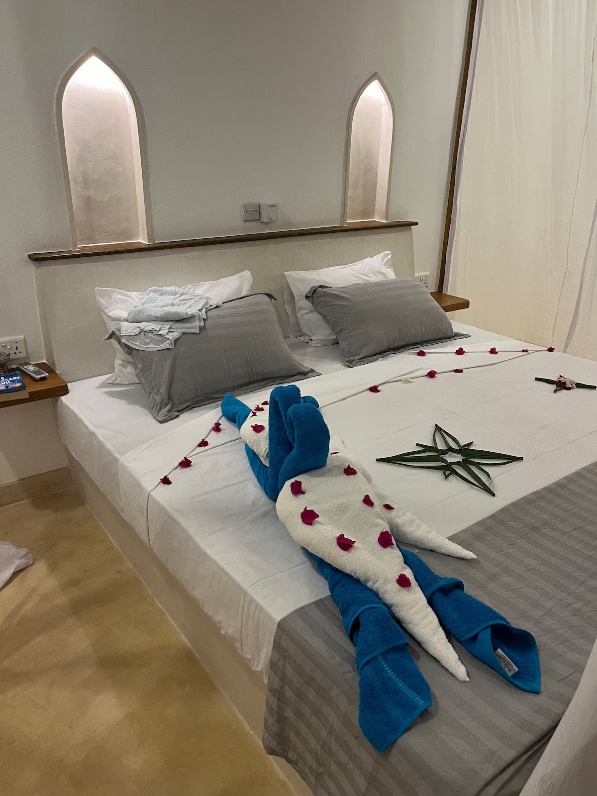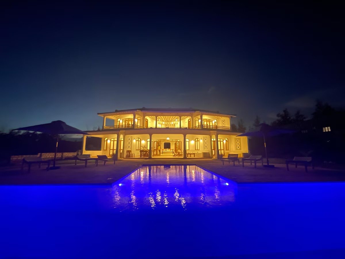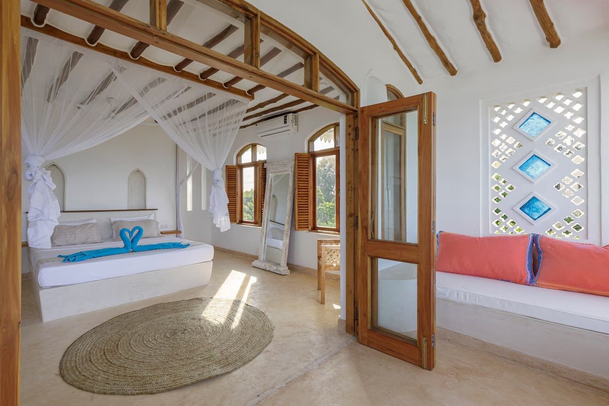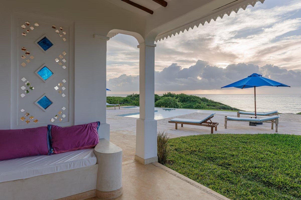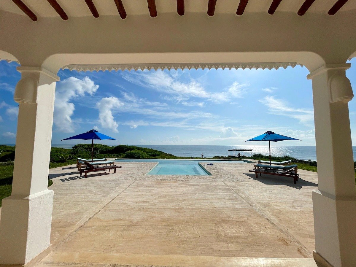 The entrance to the house has a highly carved swahili-style doorway that leads into a courtyard with a view through to the infinity swimming pool and sea beyond.