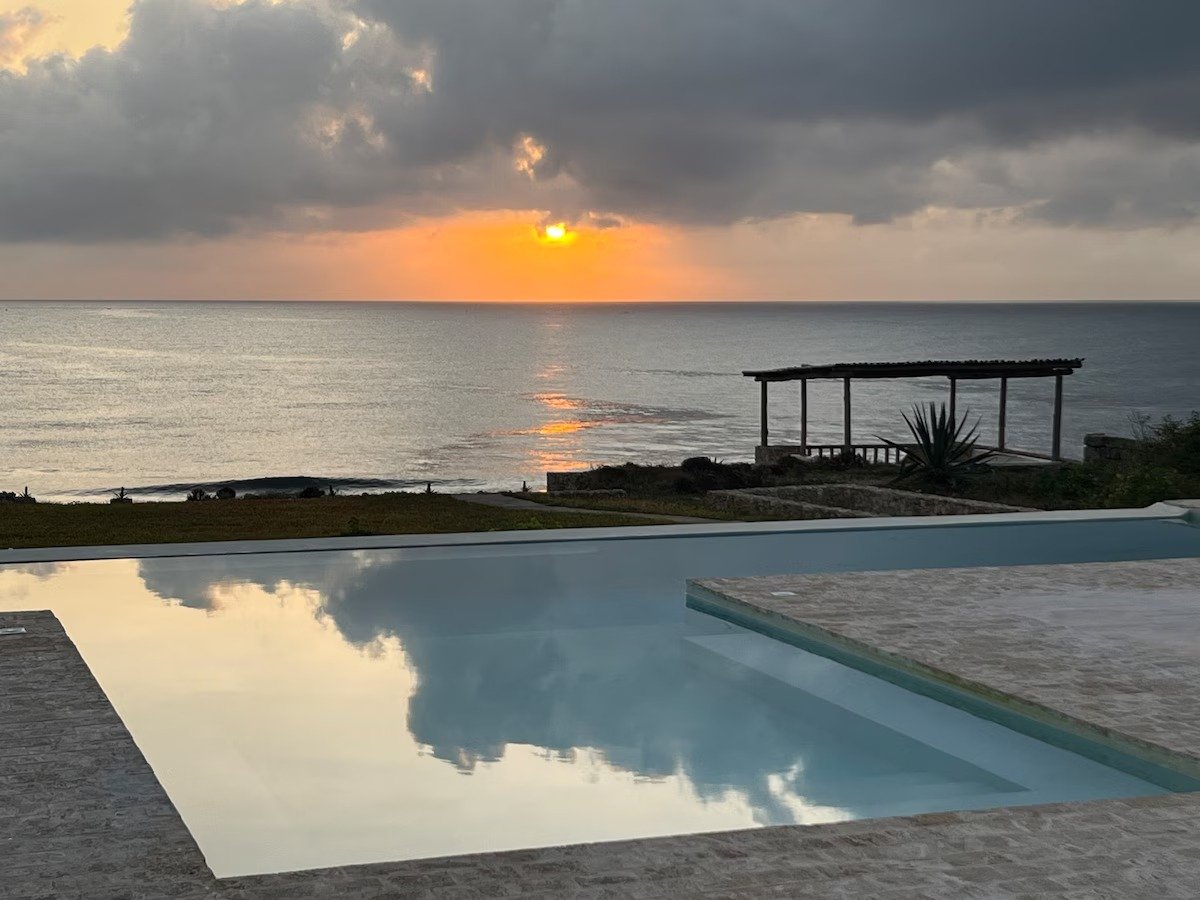 The swimming pool is 15m wide and has steps into it from the terrace area, with sun loungers and umbrellas next to it. It sits above the terraced lawn area that leads down to the look out and cliff edge. Also we have provided a tunnel with steps down to the sea level – swimming off the coral shelves below the cliff and access to a small beach to the south of the property is possible around low tide. [Please note that neither the pool or cliff edge are fenced so we do not recommend renting the property if you are bringing young children with you. Further we will ask you to sign an indemnity against potential accidents that may occur while on the property.]