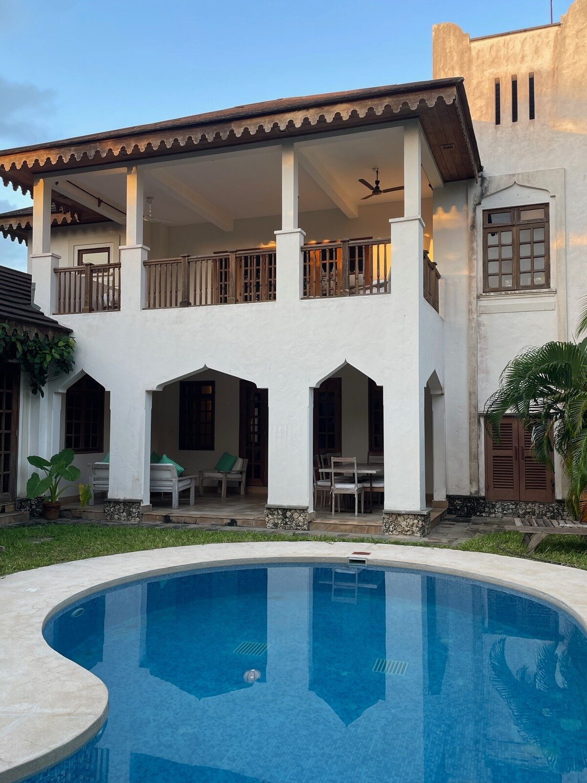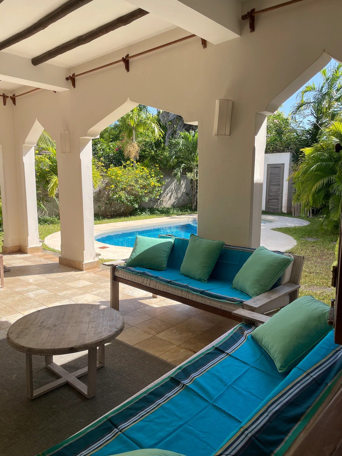 Cozy ground floor verandah with sofas and coffee tables. Opens to the backyard and the swimming pool.