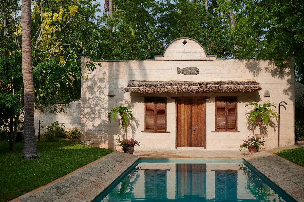 Garden : comfortable sun beds and swing-bed are placed to look over the pool. The design of the building lends a natural cooling effect.
