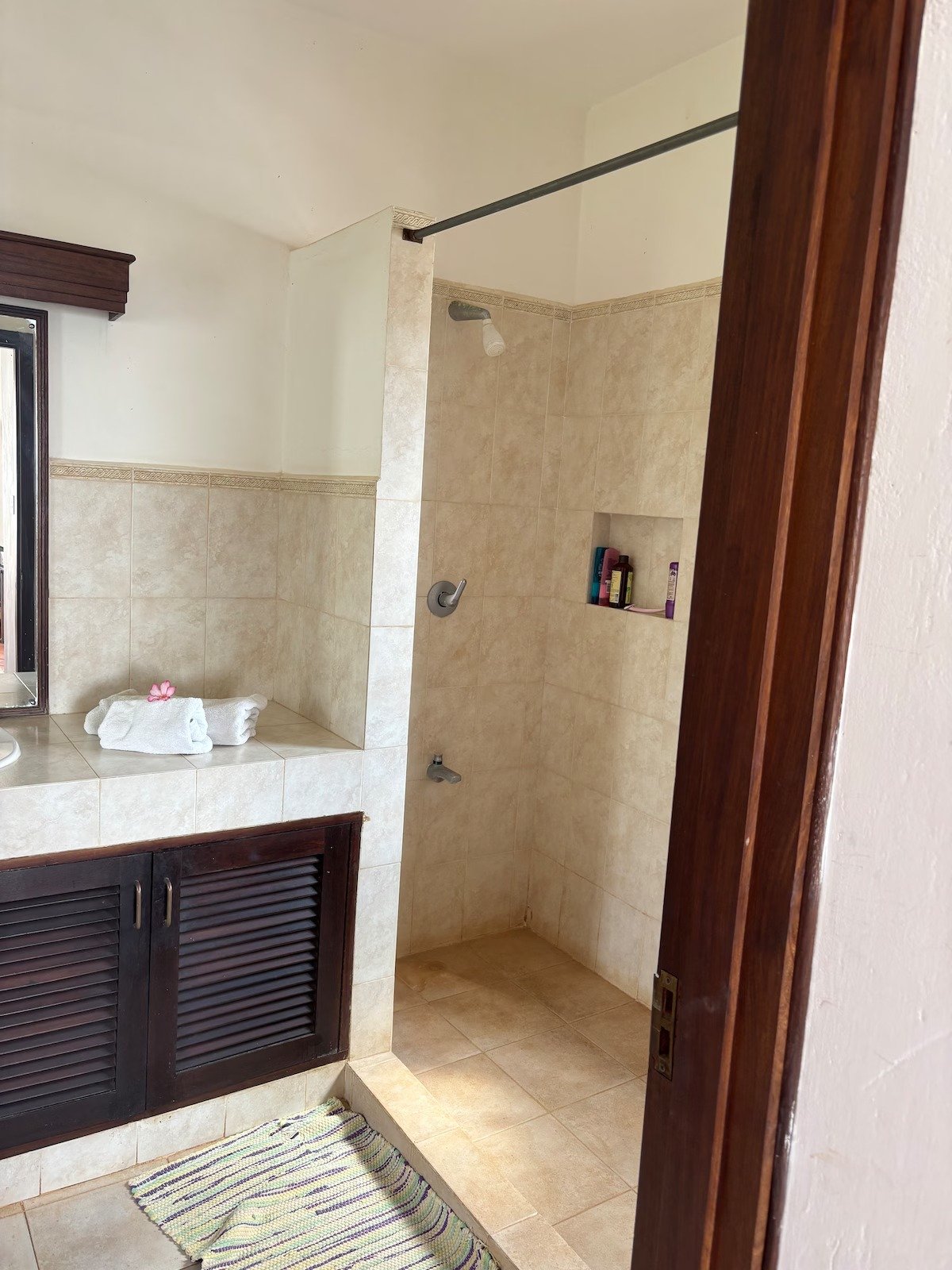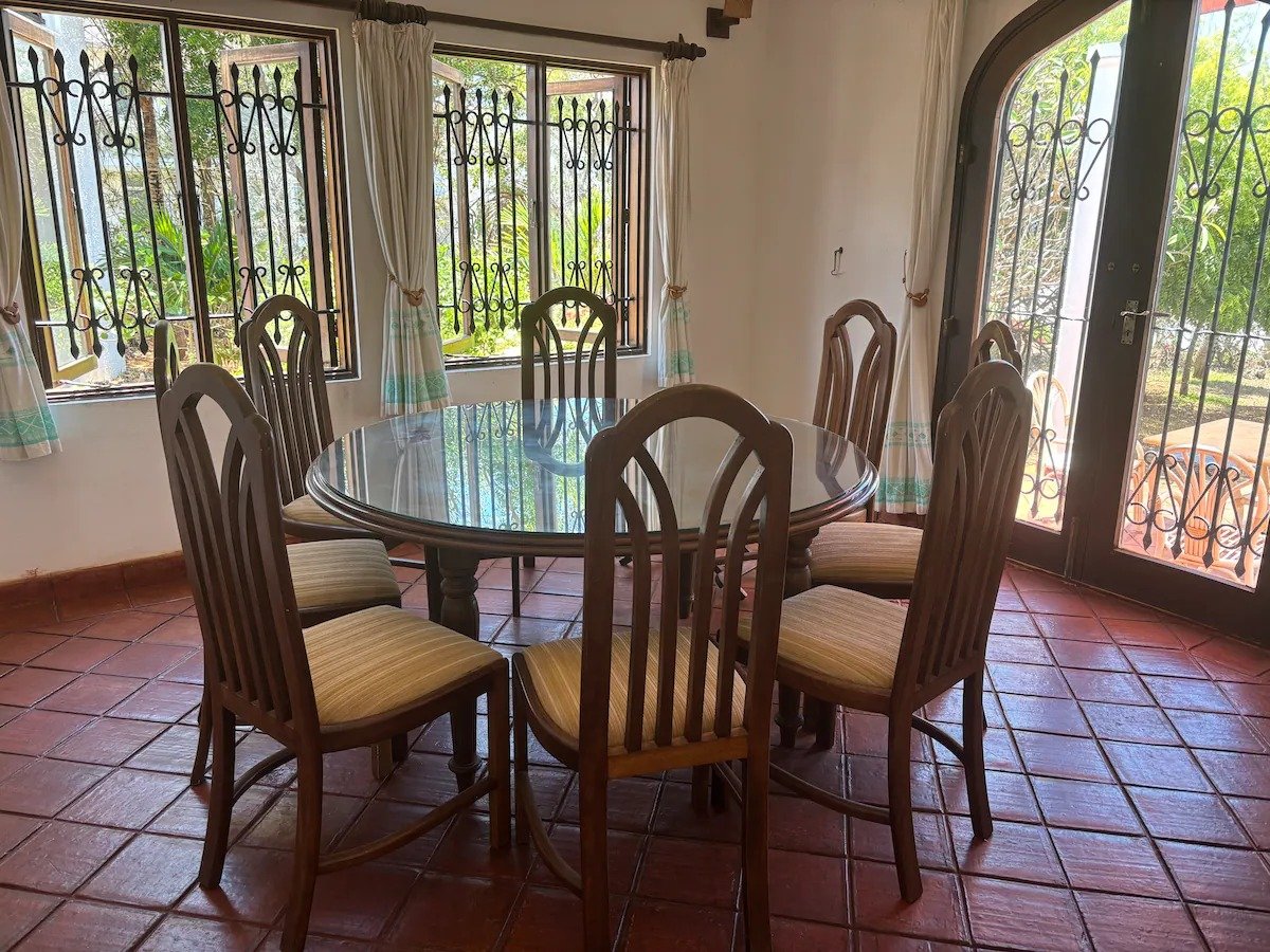 The main house has 4 double bedrooms, and 4 bathrooms (3 en-suite.) An adjacent self-contained cottage adds 2 double bedrooms and two bathrooms. All have overhead fans,