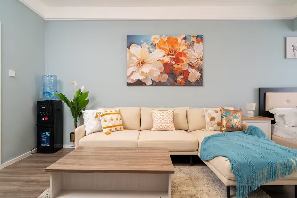 This spacious upscale studio apartment is on the 6th floor in a new, modern building. The studio has an open floor plan that maximizes space and light, creating a chic and inviting atmosphere.